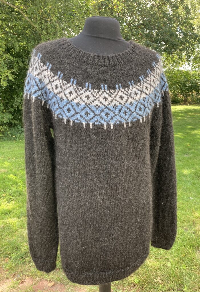 Small: omkreds 87cm. 300g bundfarve,2x50g farvet. 560kr